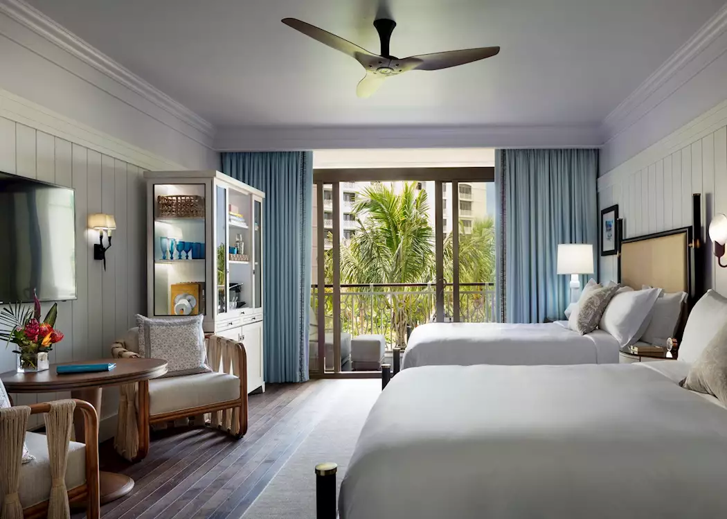 - Garden View and Ocean View rooms have a king or two queens, a balcony, and a large bathroom with a soaking tub and rain shower.