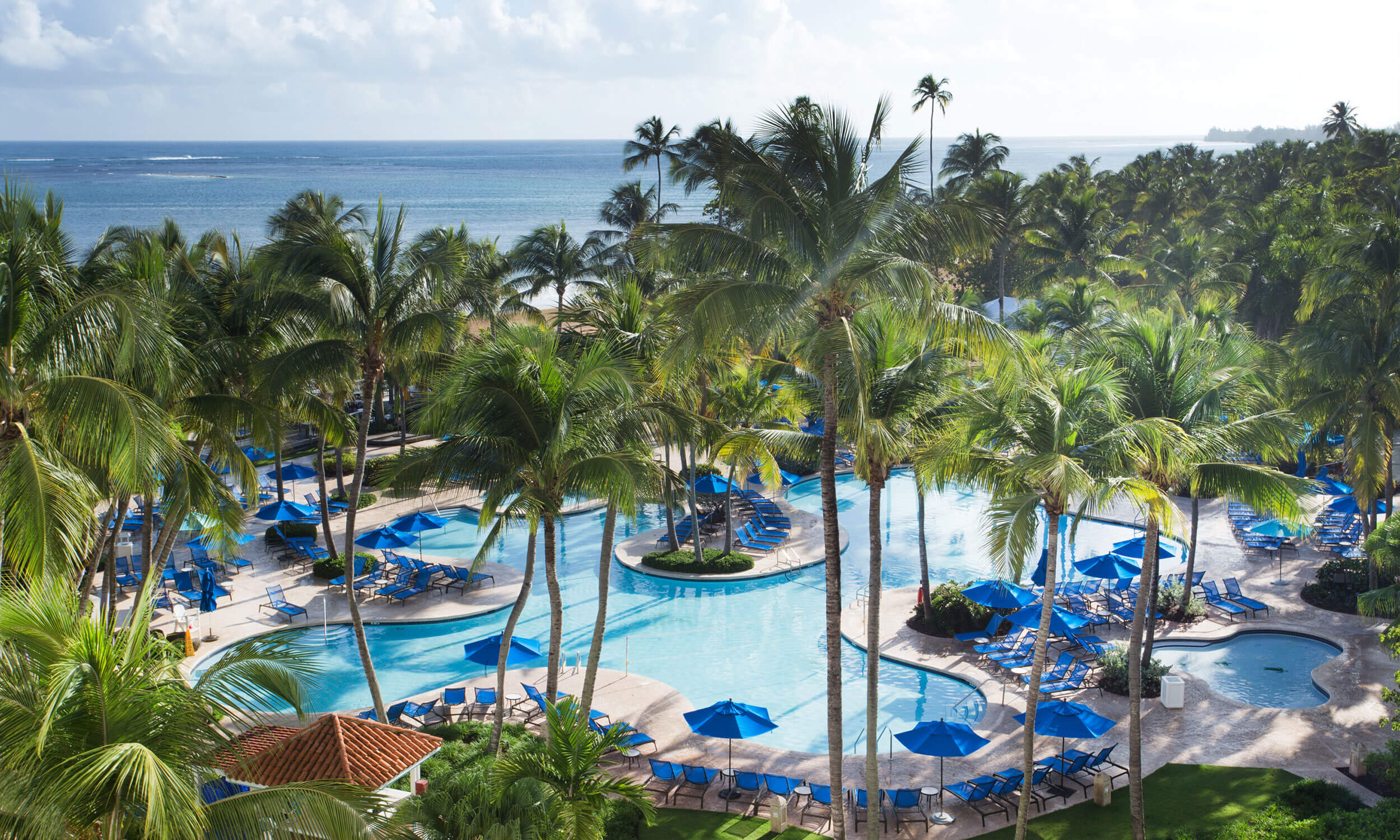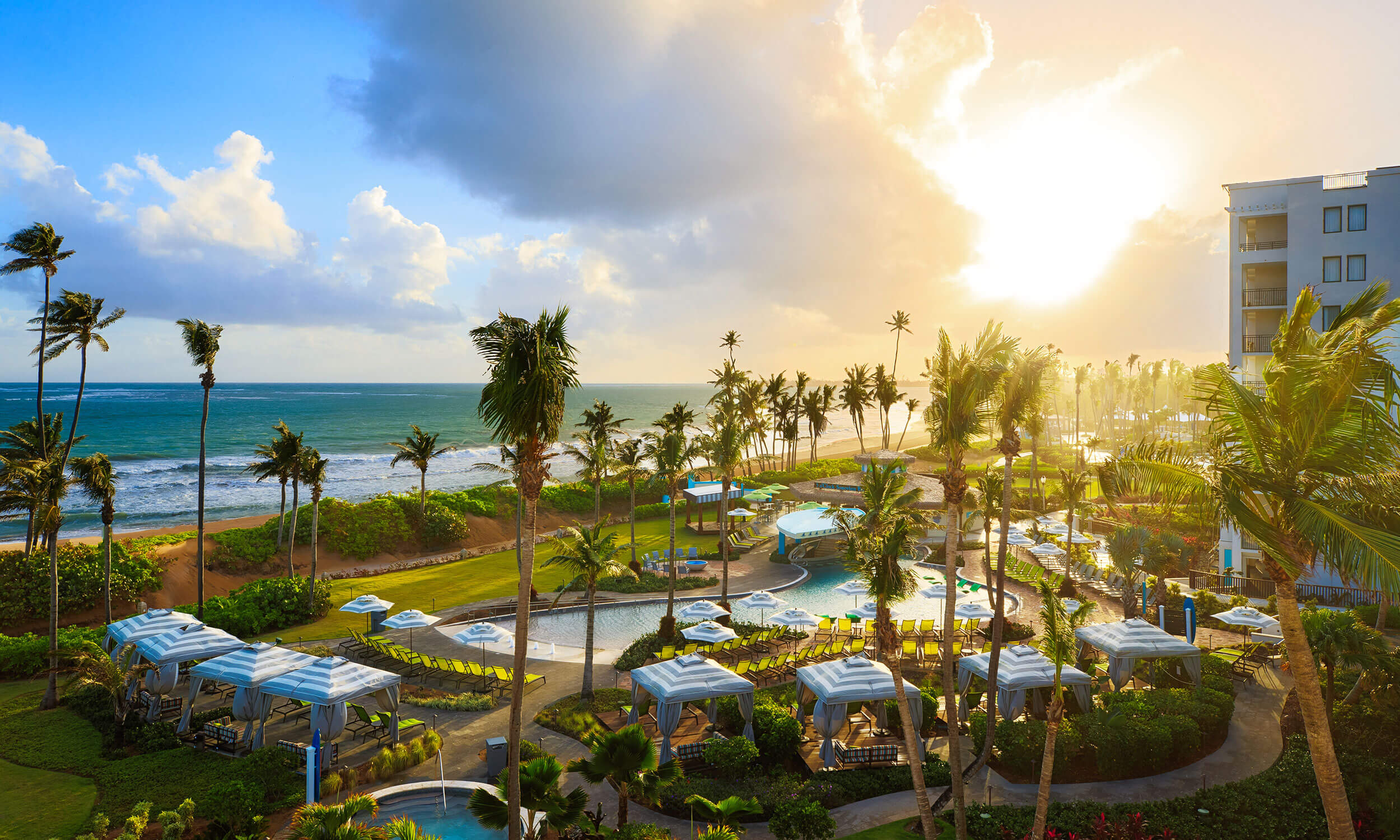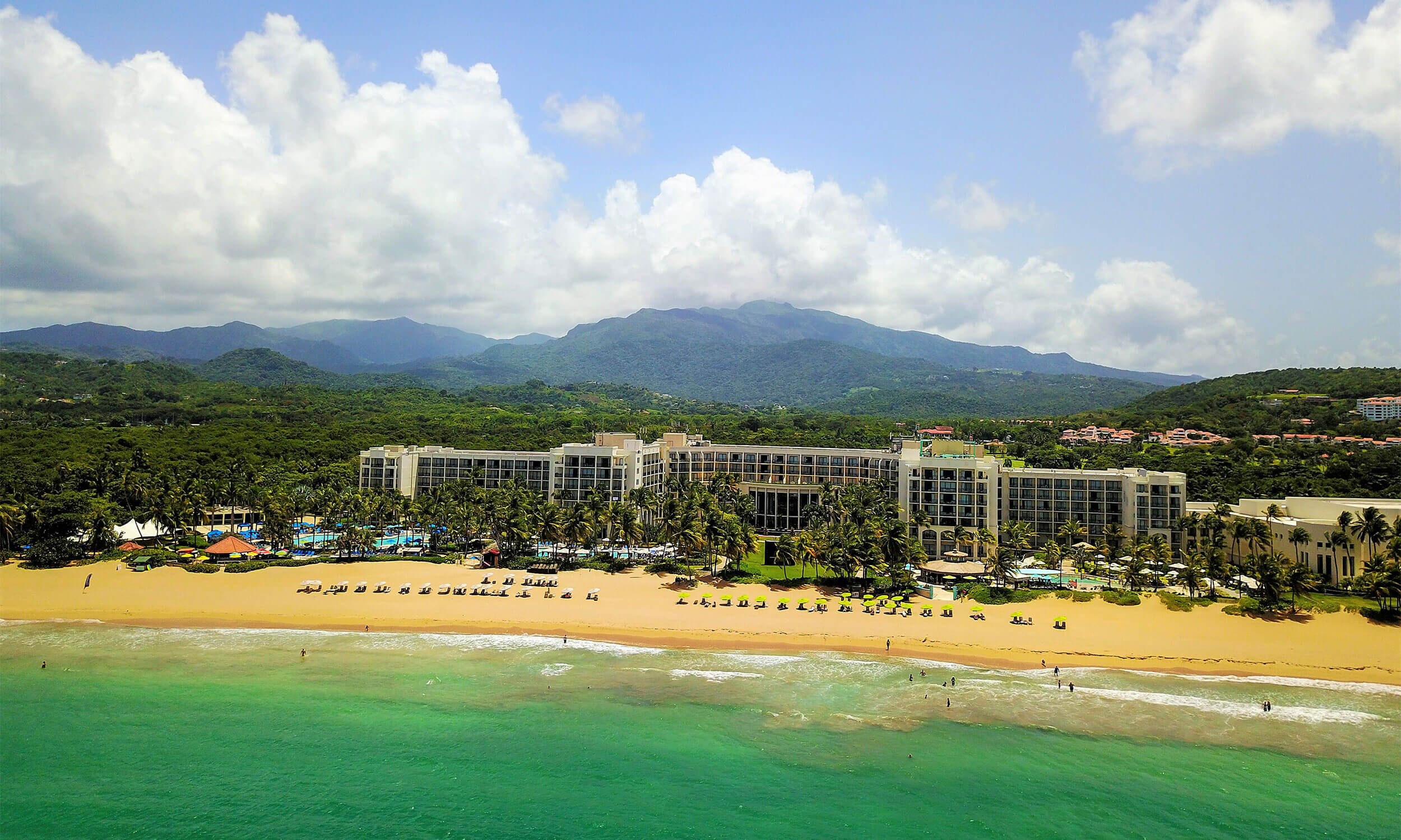 500‑acre beachfront escape with oceanfront pools and splash zones, supervised Xplorers Club, and two championship golf courses steps from El Yunque rainforest.